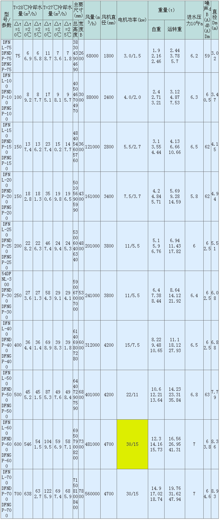方型逆流式中高(gāo)溫降工(gōng)業(yè)型≠DFN系列冷(lěng)卻塔主要(yào)參數(shù)表
